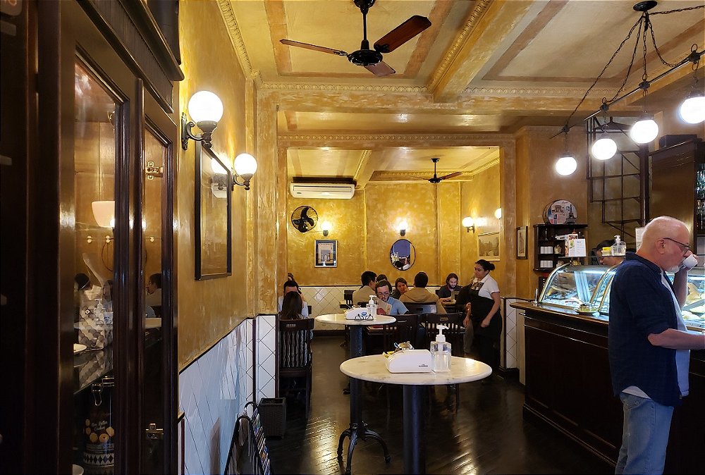 Café serve a gastronomia brasileira do dia a dia em sala neoclássica de prédio histórico com vista panorâmica.